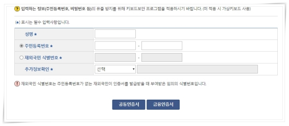 3. 성명, 주민등록번호, 추가정보 확인을 입력 후 공동인증서 또는 금융인증서로 본인 확인을 진행해 주세요.