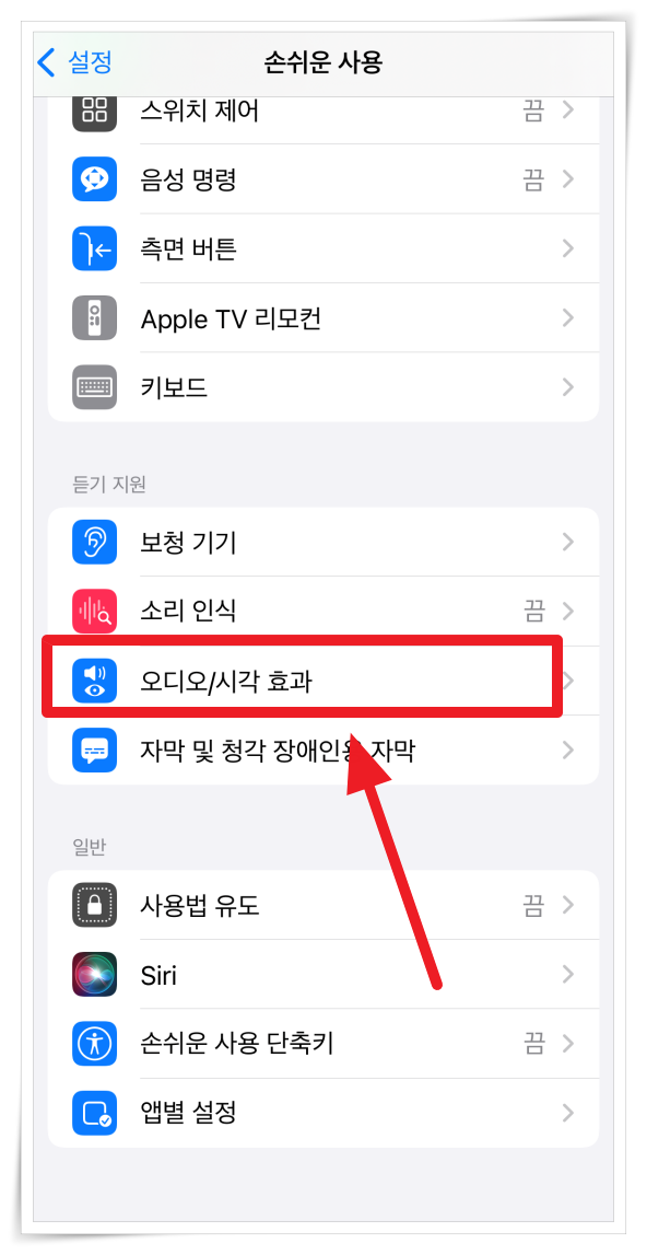 3. 듣기 지원에서 "오디오/시각 효과"를 클릭해 주세요.
