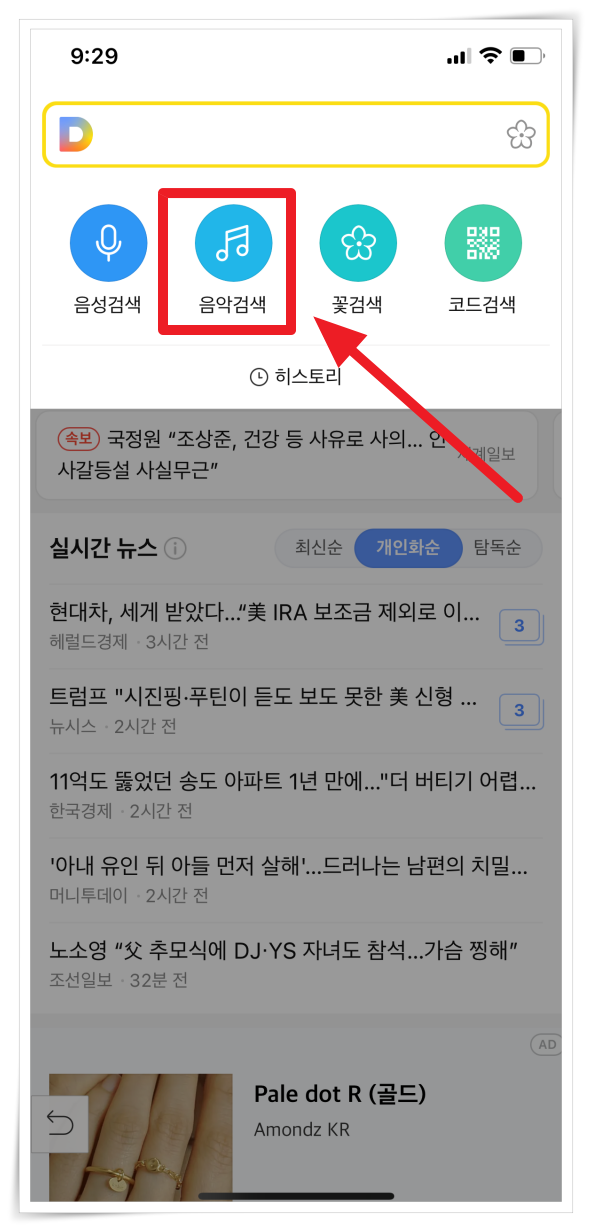 1. 다음 앱 설치 후 검색 창 우측 아이콘을 클릭해 주세요.