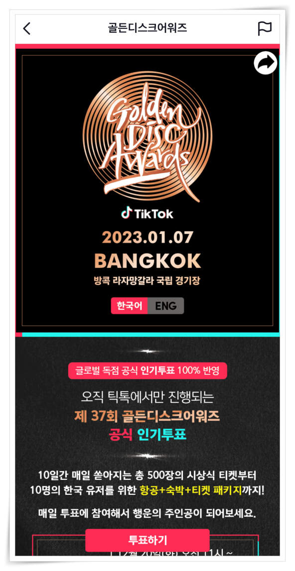 이번 포스팅은 2023 골든디스크 투표 참여 방법을 알아볼게요. 올 한 해도 어느새 저물어 가고 2023년 검은 토끼의 해가 다가오고 있습니다. 계묘년 시작과 함께 즐거운 축제도 열리는데요. 바로 골든디스크 어워즈 시상식입니다. 이 시상식은 우리나라에서 가장 오래된 음악 어워즈라고 합니다. 1986년 대한민국 영상 음반 대상으로 개최되어 현재까지 이어오고 있다고 해요. 올해는 1월 7일 태국 방콕에서 개최가 되는데요. MC는 4년 연속 안정적인 진행을 맡아온 성시경과 이다희가 결정되었습니다. 여기에 태국의 왕자 닉쿤과 배우 박소담이 가세하여 현장 분위기를 이끌 예정이라고 하네요. 음악 시상식에서 공연을 빼놓을 수 없죠. 현재 2차 라인업까지 공개가 되었는데요. 1차 라인업 뉴진스, 르세라핌, 세븐틴, 스트레이 키즈, 엔하이픈, 트레저 확정되고 2차 라인업으로 여자아이들, 비오, 빅나티, 아이브, 제이홉, 윤하가 출연한다고 밝혔습니다.