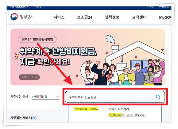 1. 정부24 홈페이지 검색창에 "주민등록증 신규발급"을 검색해 주세요.