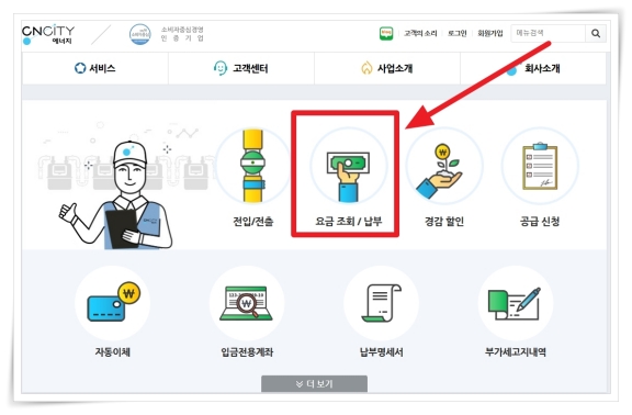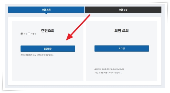 1. 공식 홈페이지 중단 메뉴에서 "요금조회/납부"를 클릭해 주세요.