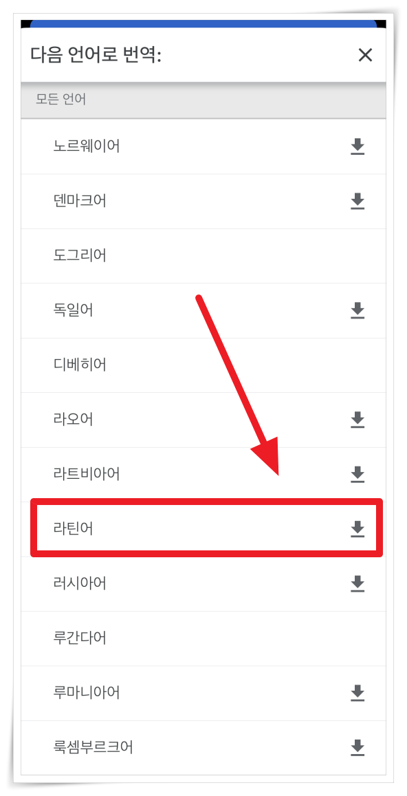 2. "라틴어" 우측에 다운 버튼을 클릭해서 언어팩을 설치해 주세요.