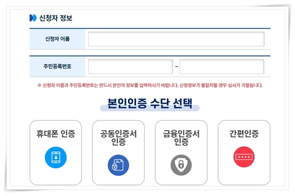 4. 신청자 이름 및 주민등록번호를 입력 후 본인인증을 진행해 주세요.
