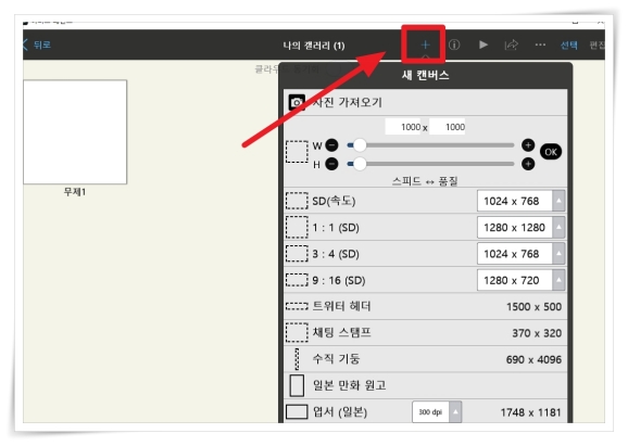 6. 우측 상단 + 아이콘을 클릭 후 캔버스를 설정해 주세요.