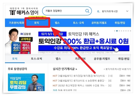 1. 홈페이지 상단 메뉴에서 "토익"을 클릭해 주세요.