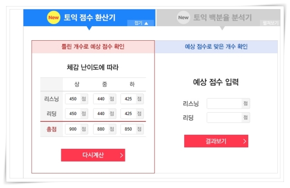그리고 토익시험 당일에 자신의 예상점수를 확인하려는 응시생들이 급격히 늘어났는데요. 이럴 때 점수 계산기를 이용하면 체계적인 점수 환산 시스템으로 점수를 분석해 난이도에 따라 실시간으로 총점을 확인할 수 있습니다.