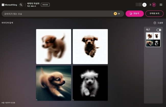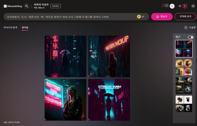 대표적은 AI 그림 서비스 중에 마이크로소프트의 Bing Image Creator가 있습니다. 다른 서비스에 비해 쉽게 접근할 수 있고 제한 없이 무료로 이용이 가능합니다. 누구나 간단한 명령어만 입력하면 상당한 품질의 결과물을 만들어 낼 수 있습니다.