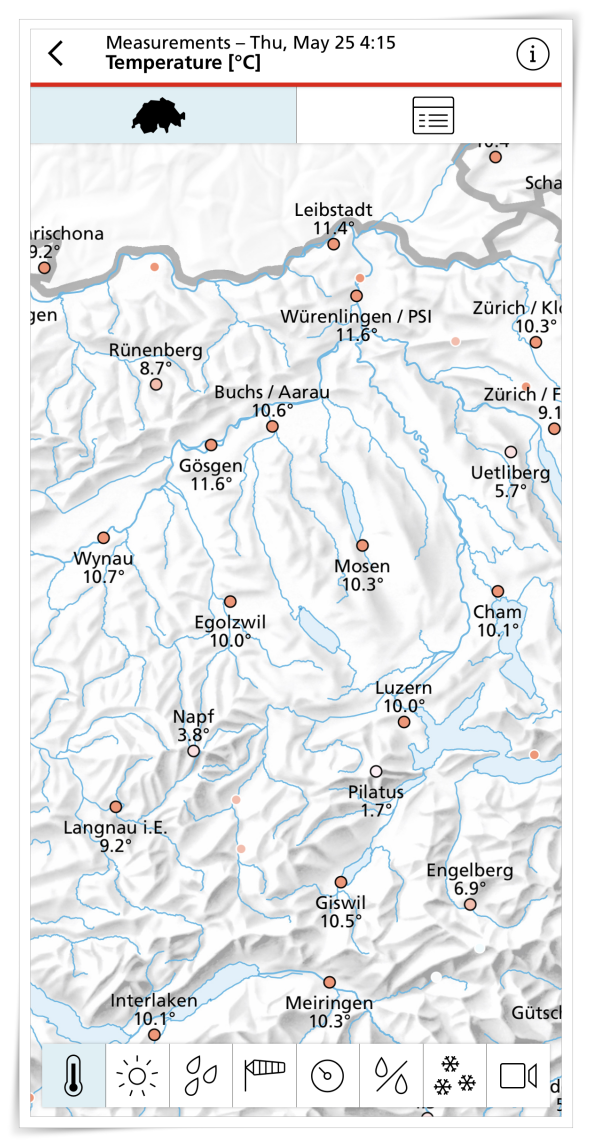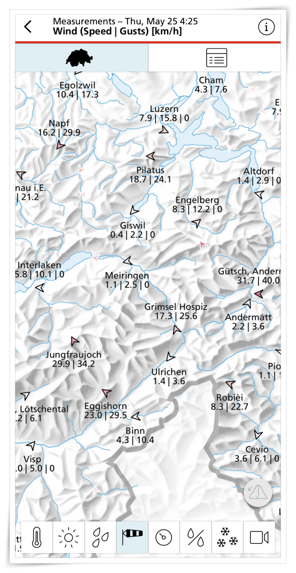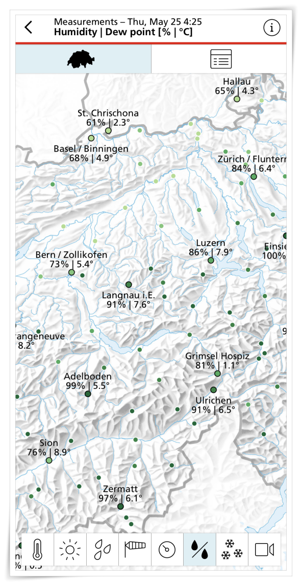 2. 그러면 스위스 전지역의 습도, 온도, 바람, 눈, 비에 대한 정보를 보실 수 있는데요.