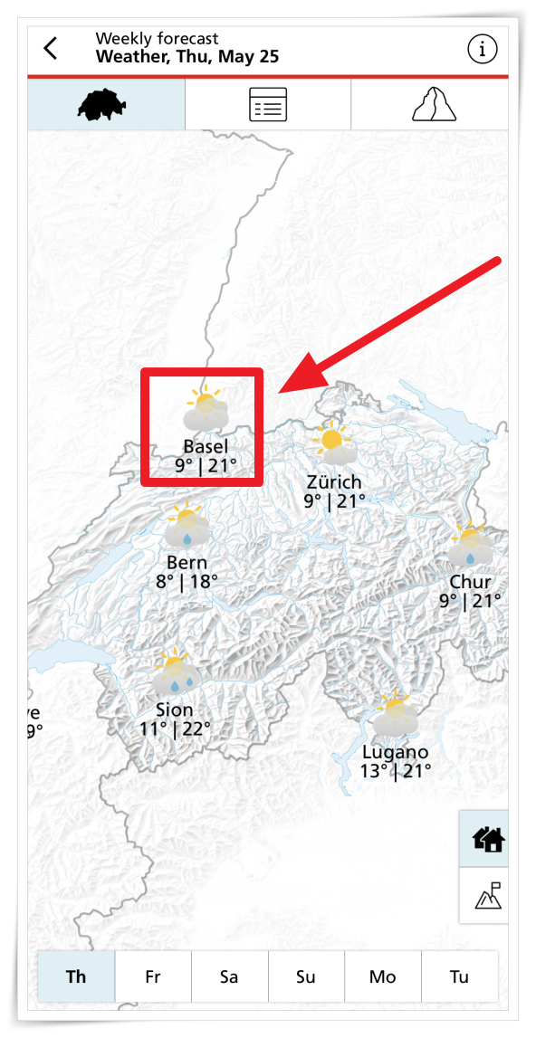 그리고 여행에 있어서 중요한 것은 현지 온도와 날씨이죠. 사람이 활동하기 좋은 기온이 19~27도 사이라고 하는데요. 스위스 체감온도가 그 사이일 때는 5월 ~ 9월입니다. 이 시기가 스위스 여행하기 가장 좋은 게정이라고 할 수 있습니다. 그리고 현재의 날씨와 온도 정보를 확인하고 싶다면 앱을 통해 쉽게 알아보실 수 있어요.