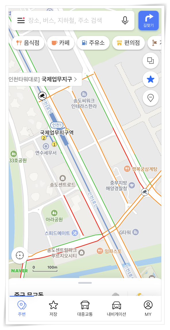 5. 이밖에도 메뉴에서 "교통정보"를 체크하면 색상으로 도로 상황을 확인할 수 있습니다.