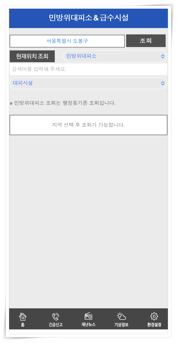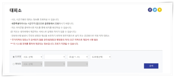 내 주변의 대피소가 궁금하다면 웹에서 조회를 통해 미리 확인해 보실 수 있는데요. 지역을 선택하면 가장 가까운 대피소를 찾으실 수 있습니다. 실제 상황이 발생하면 사용자가 많아 이용이 불가능할 수 있습니다. 사전에 미리 찾아보고 확인하는 것이 좋습니다.