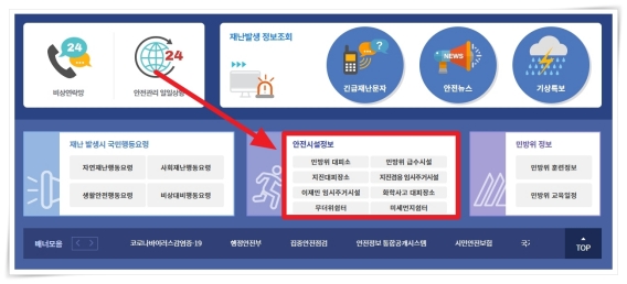 1. 홈페이지 중단 "안전시설정보"에서 "민방위 대피소"를 클릭해 주세요.