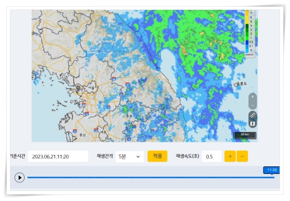 3. 지도 하단 플레이 버튼을 클릭하면 5분간격으로 비구름의 이동 방향을 확인하실 수 있습니다.