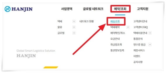 1. 홈페이지 상단 메뉴에서 "예약/조회" > "배송조회"를 클릭해 주세요.