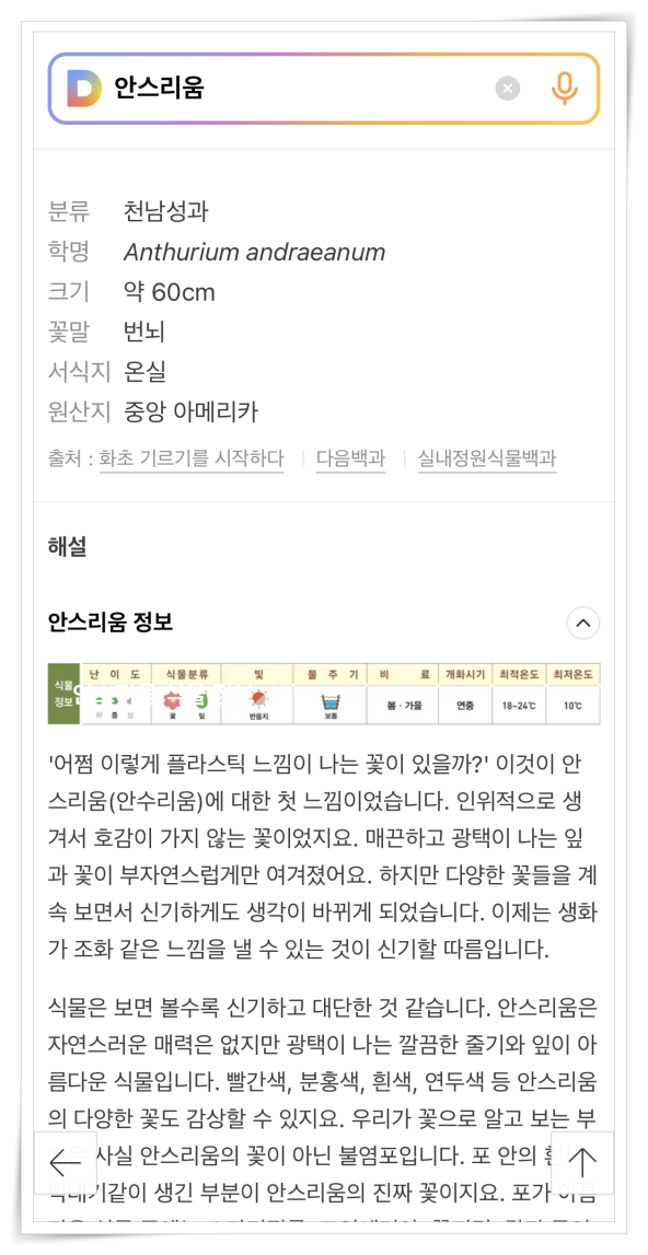 5. 결과에서 학명, 크기, 꽃말, 서식지, 원신지를 볼 수 있습니다. 더 자세한 정보는 "해설보기"를 클릭해 보세요.