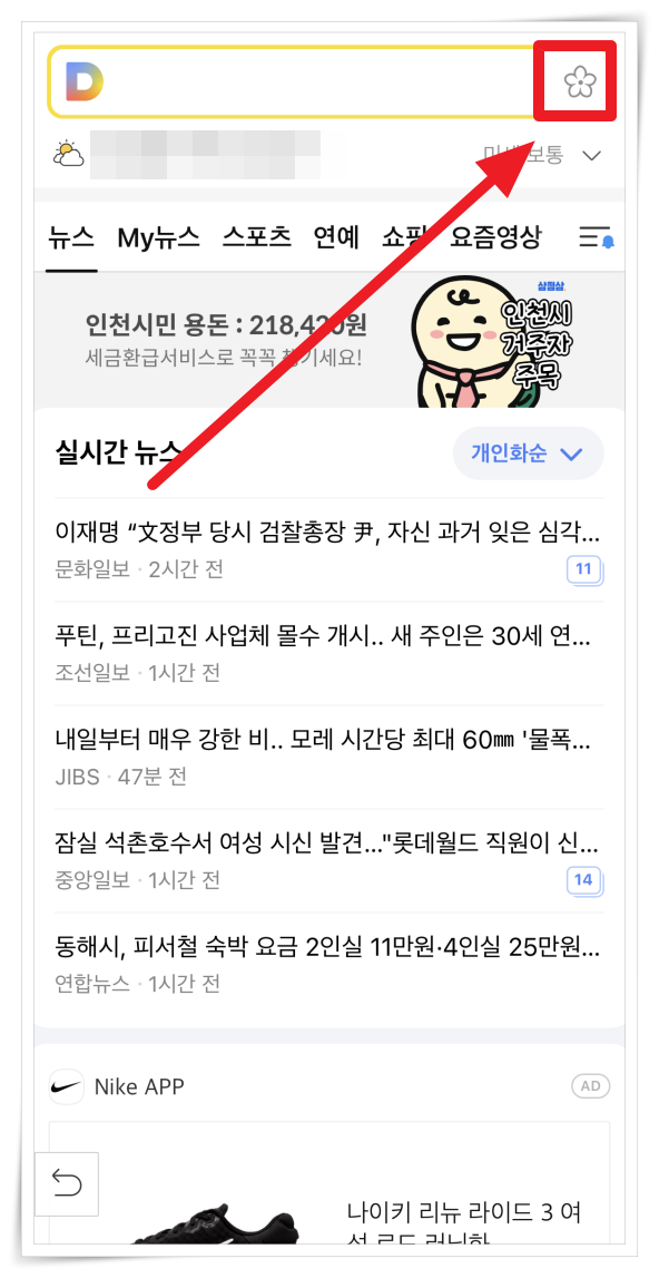 1. 먼저 다음 앱을 설치 후 우측 상단 검색창 옆에 "꽃 무늬 아이콘"을 클릭해 주세요.