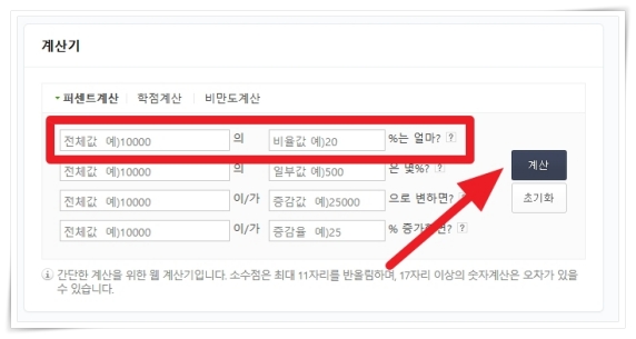 1. 계산하기 번거럽다면 퍼센트 계산기를 통해 확인이 가능합니다. 전체값에 임금을 넣고 비율값에 3.3%를 입력하고 계산을 눌러 보세요.