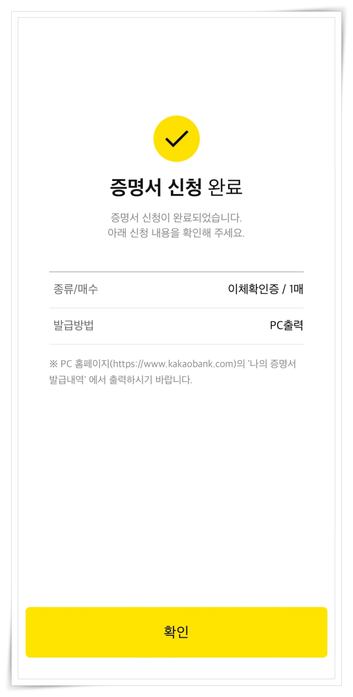 카카오뱅크에서 이 문서를 출력하려면 두가지 방법을 이용할 수 있습니다. PC 또는 우편으로 해결하실 수 있는데요. PC의 경우 앱에서 먼저 발급을 받고 PC에서 홈페이지 접속 후 출력하실 수 있습니다. 우편은 우편발송료가 부과되며 영업일 기준 약 5일 소요가 됩니다.
