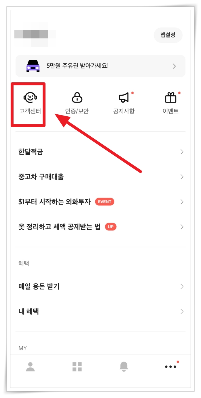 1. 앱 설치 후 우측 하단 더보기 메뉴에서 "고객센터"를 클릭해 주세요.