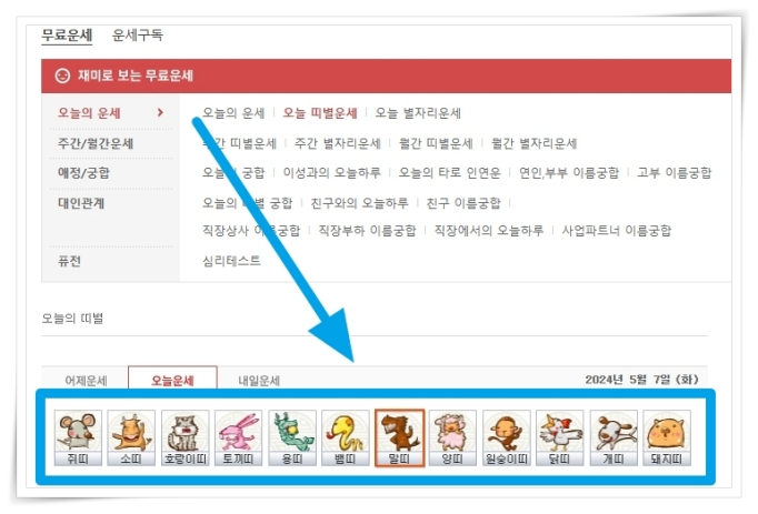 2. 오늘의 운세에서 "띠별운세"를 클릭해 주세세요.