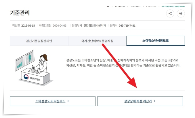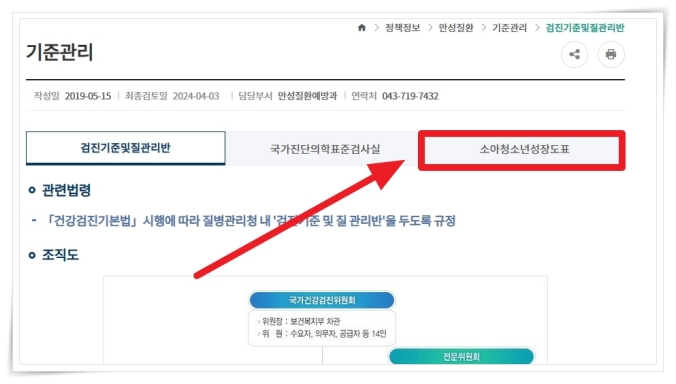 2. 기준관리에서 "소아청소년성장도표"를 클릭해 주세요.