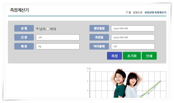 4. 성별, 신장, 체중, 머리둘레, 생년월일을 입력 후 측정을 클릭해 주세요.