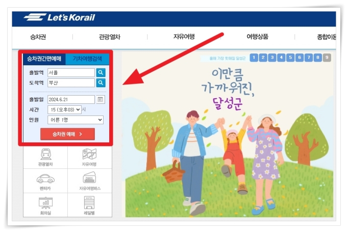 1. 공식 홈페이지 메뉴 아래 간편 예매에서 출발역, 도착역, 시간, 인원을 입력해 주세요.